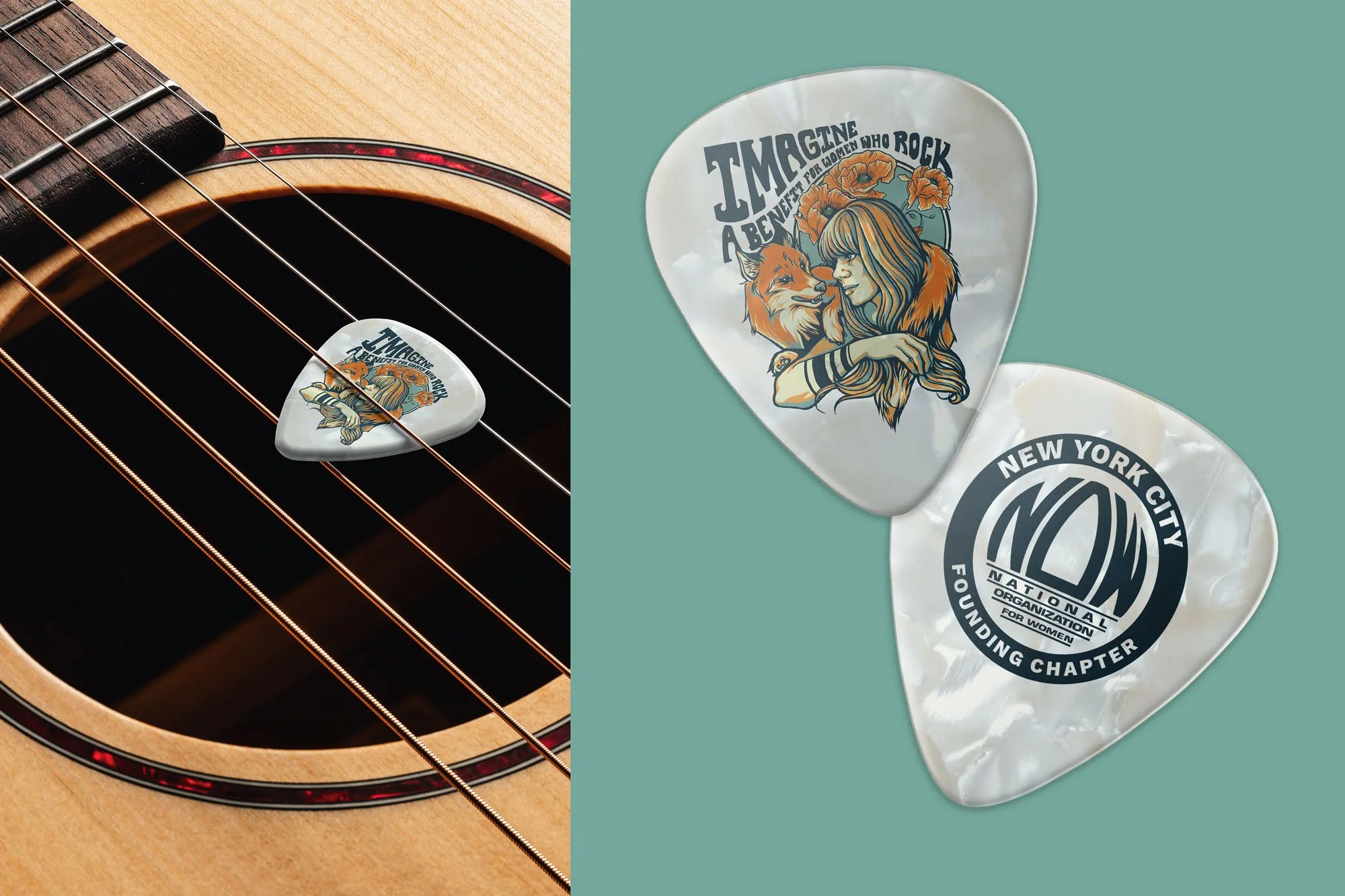 For Imagine: A Benefit for Women Who Rock, I designed promotional and merchandise assets including posters, T-shirts, custom guitar picks, and digital banners. Held in Brooklyn, NY, the event paid tribute to a late friend while raising charity funding through ticket and merchandise sales. Proceeds supported NOW NYC, an organization dedicated to advancing women’s rights and promoting gender equality.